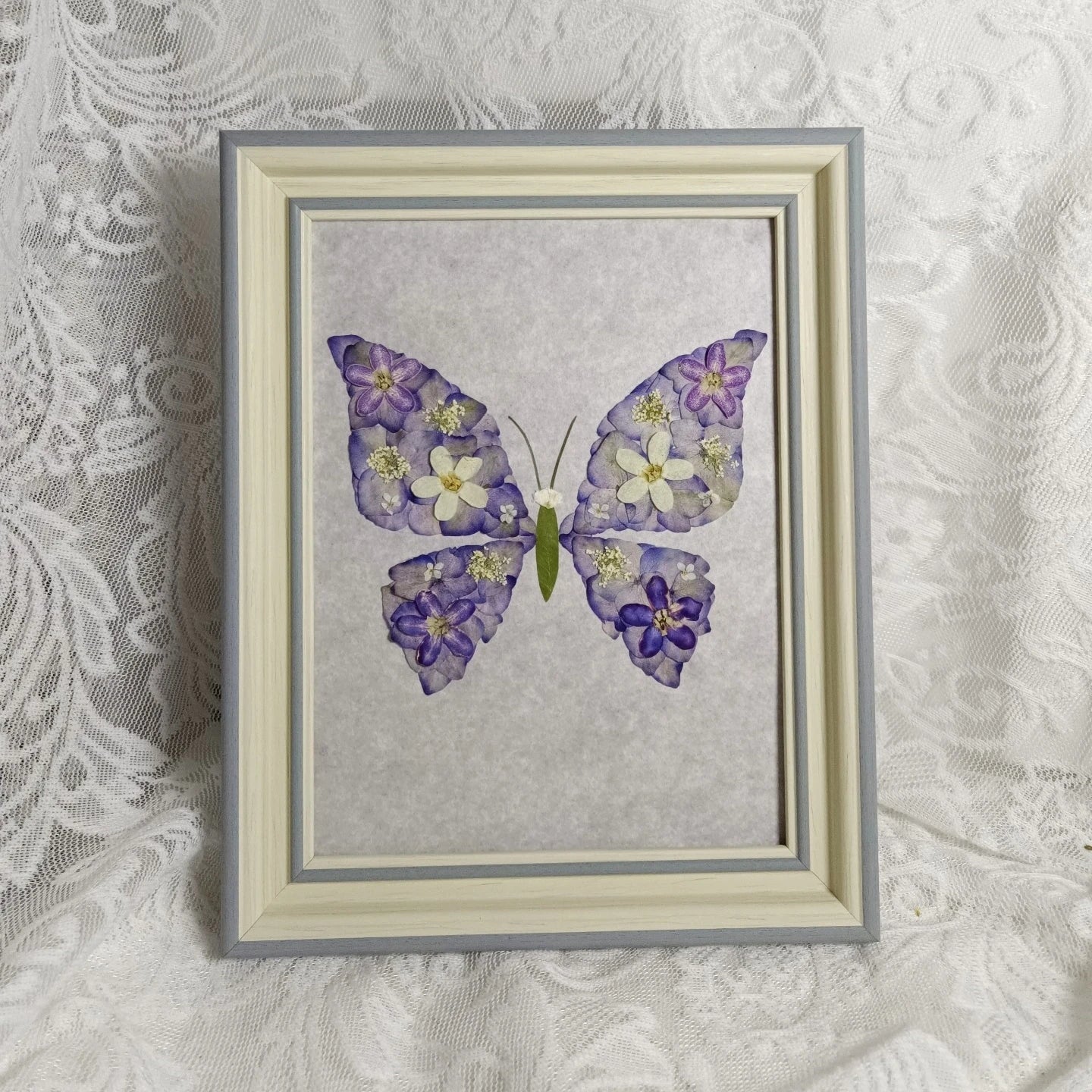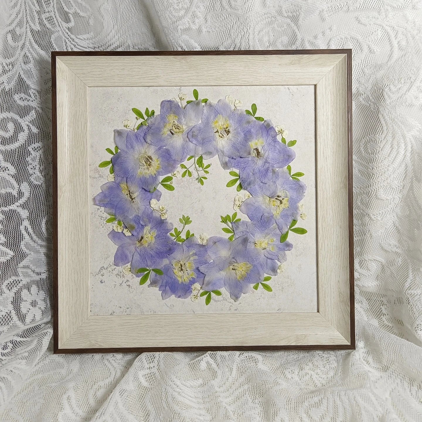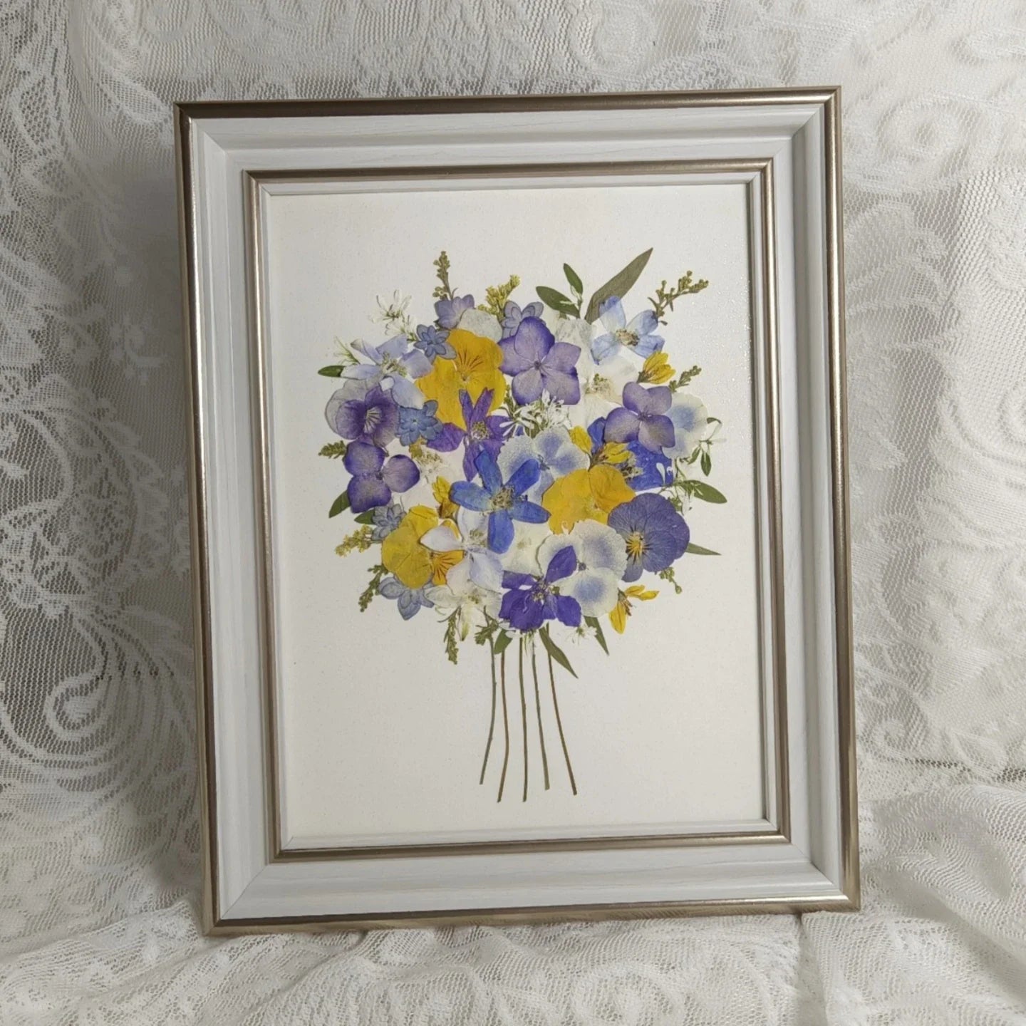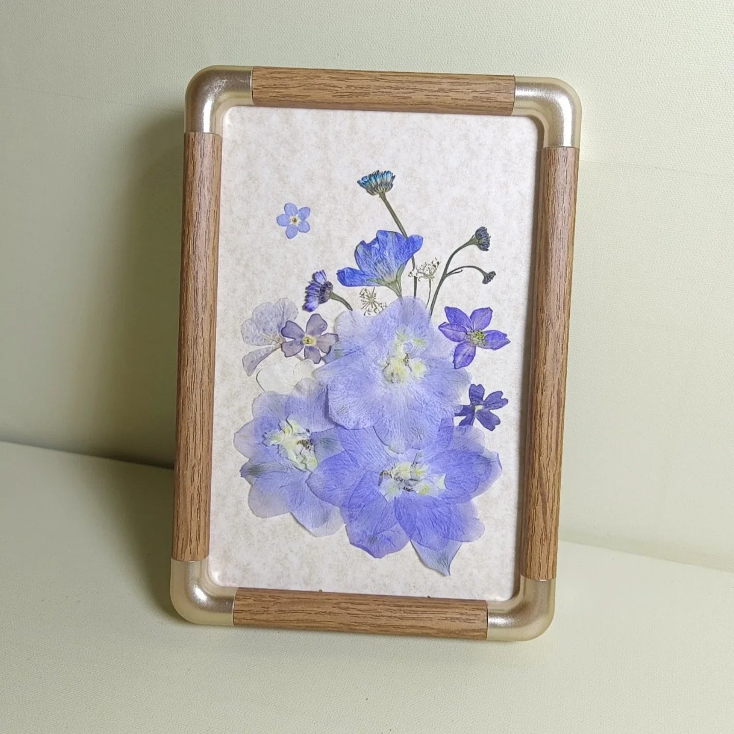 Real dried and pressed flowers, high-quality paper backing, and a solid wood or resin frame with glass cover.