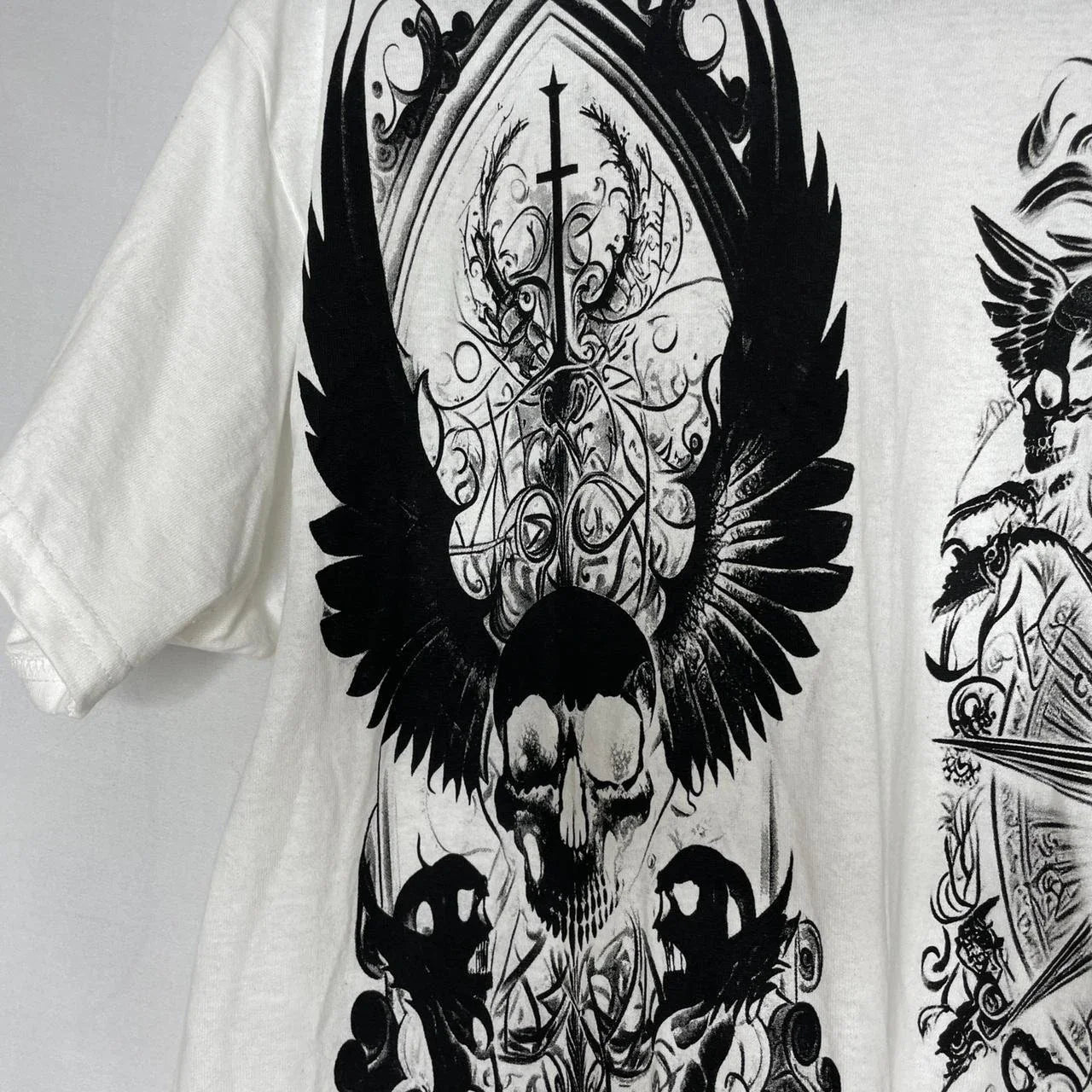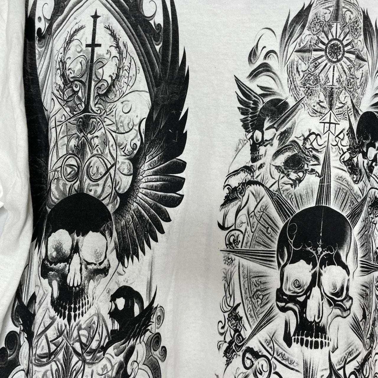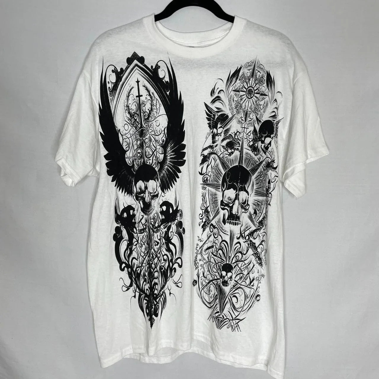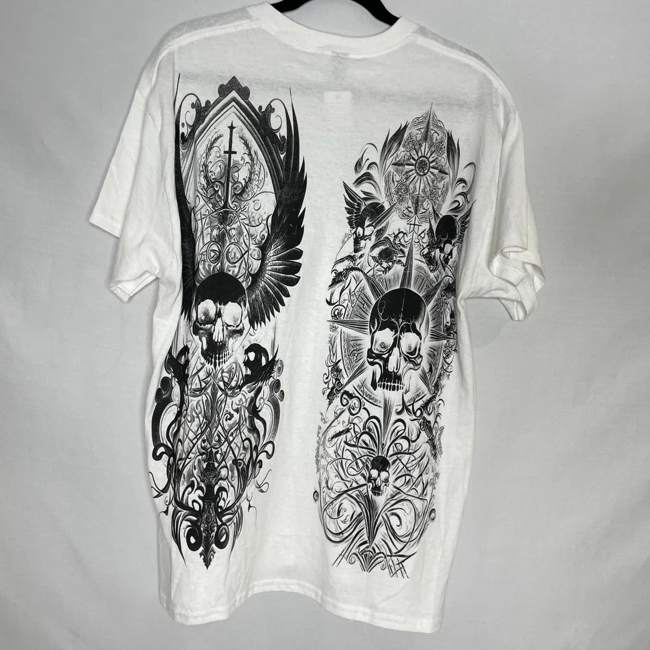 Channel early 2000s streetwear vibes with this custom hand screen-printed white tee, featuring bold skull panel designs on both front and back — a standout piece for lovers of edgy, retro fashion.