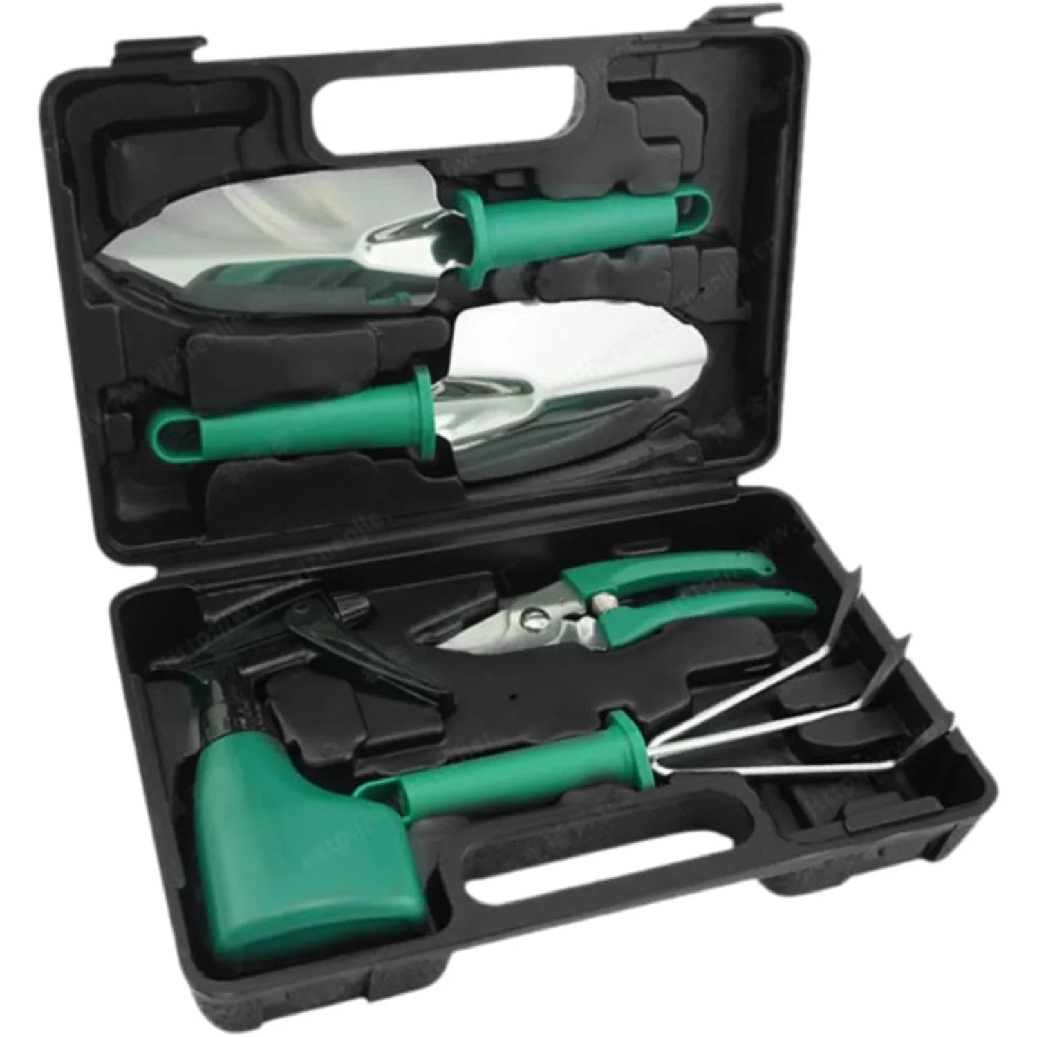 Complete set includes: hand trowel, transplanter, pruner, cultivator, and weeder