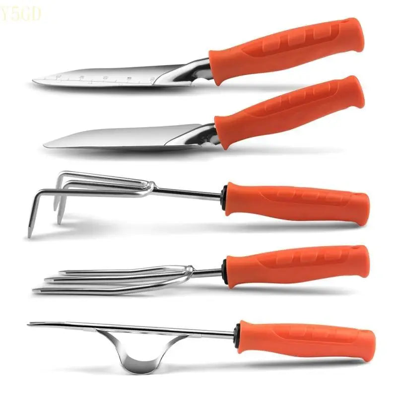 Durable metal tool heads with smooth wooden handles, designed for comfort and precision in small-scale gardening.