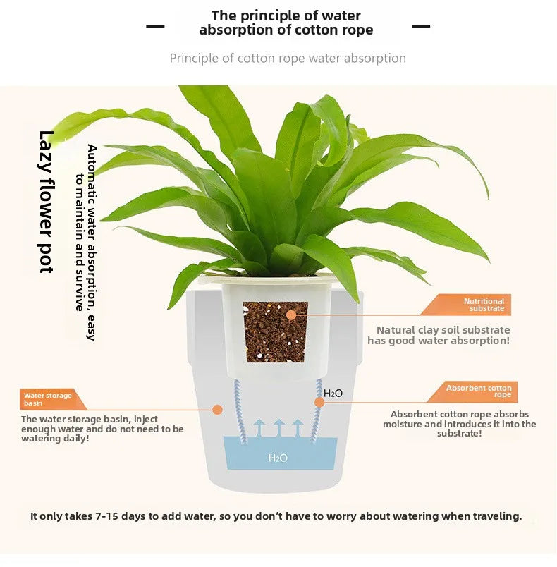 Durable, lightweight plastic with integrated water storage and cotton rope for passive watering.