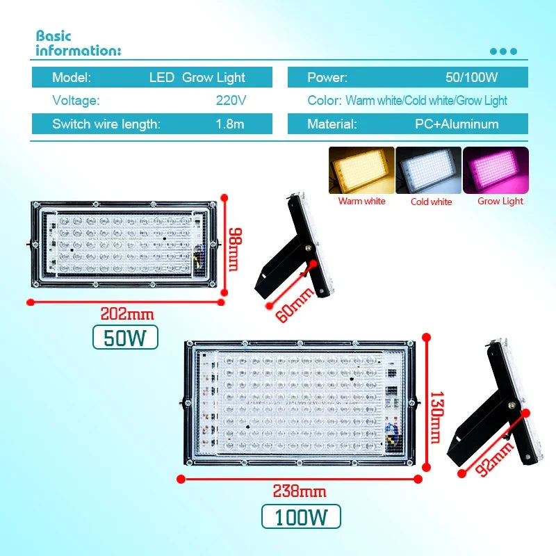 Enhance your plant growth with this 50W/100W LED Grow Light, designed for indoor gardening, greenhouses, and seed cultivation. Featuring full spectrum lighting, it supports all growth stages from seed to bloom.