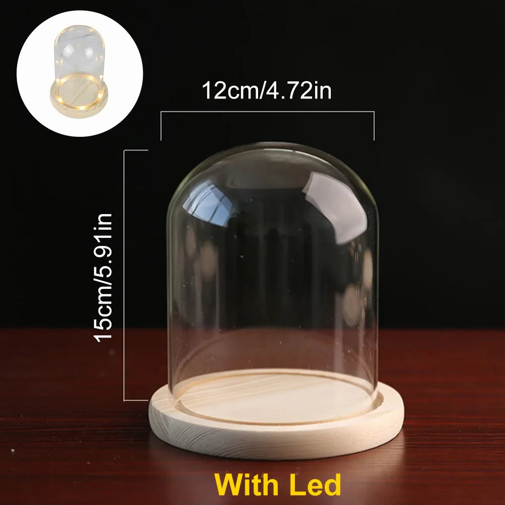 Clear Glass Dome Cloche with Wooden LED Lights Base – Terrarium Display Jar & Flower Holder