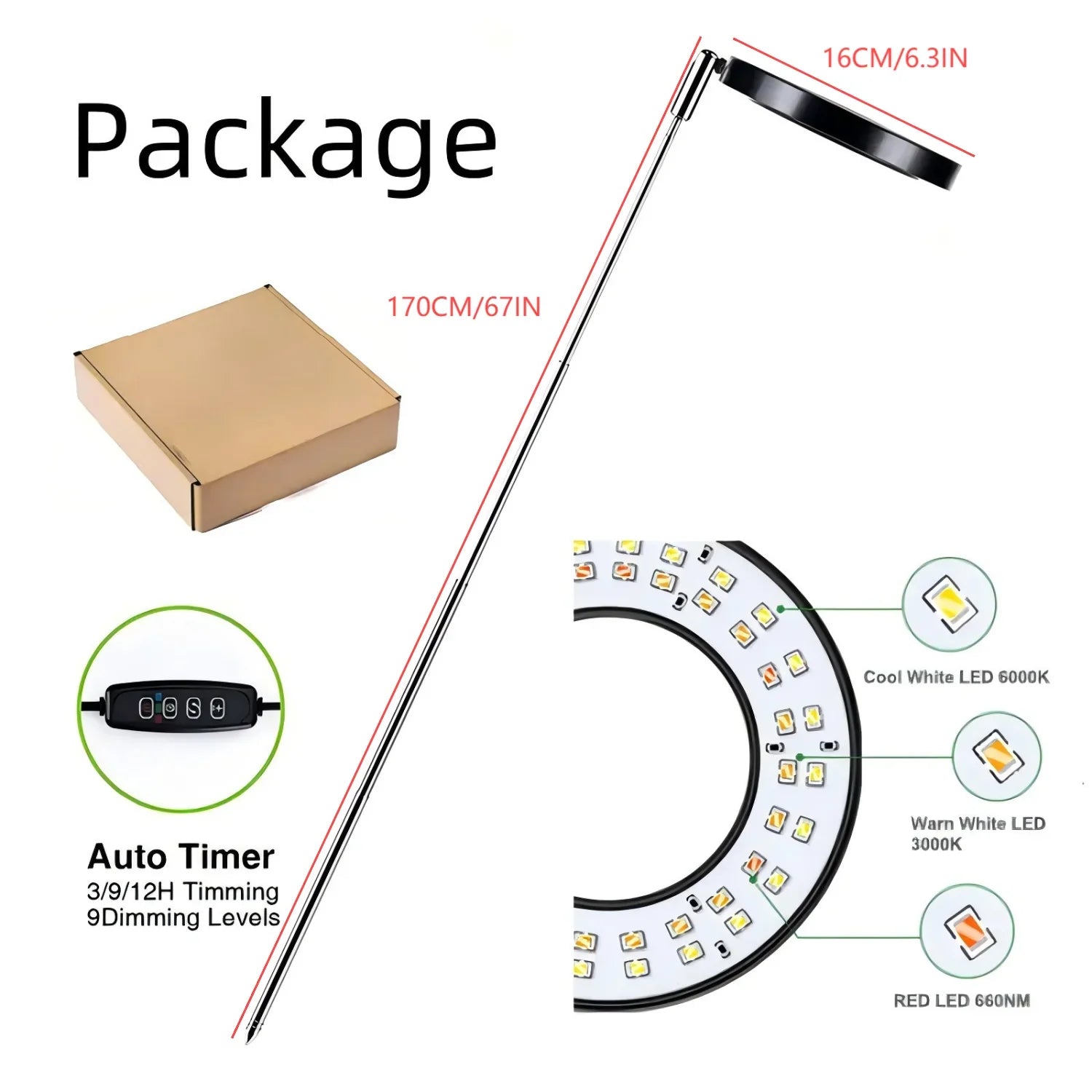 Durable ABS and aluminum alloy with energy-saving full-spectrum LEDs, adjustable stand, and built-in timer controller.