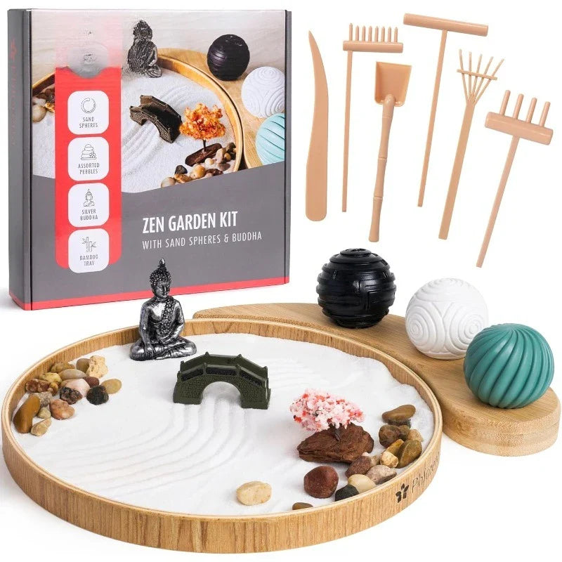 Mini Zen Garden Kit for Desk – Calming Japanese Sandbox with Buddha, Tree, Sand & Rakes