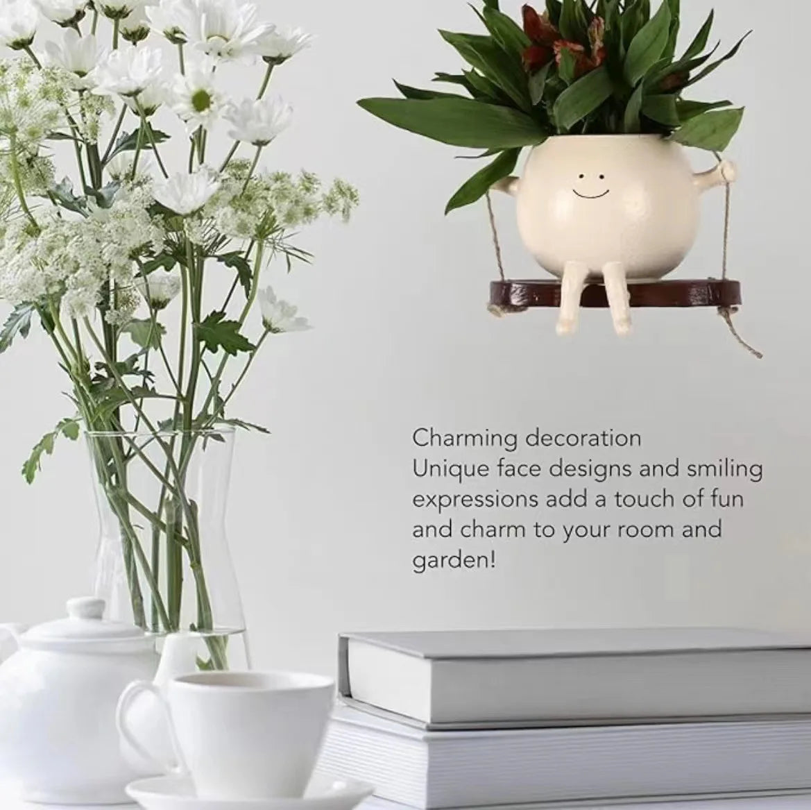 Add playful personality to your garden or patio with this swing-style cartoon head flowerpot — a fun and functional wall-hanging planter perfect for brightening up any indoor or outdoor space.